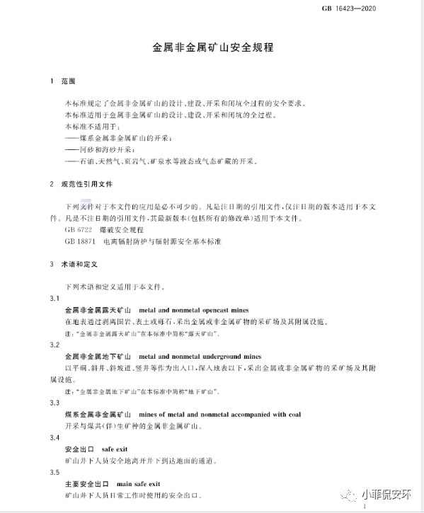 GB16423-2020《金屬非金屬礦山安全規(guī)程》,2021年9月1日起實(shí)施!
