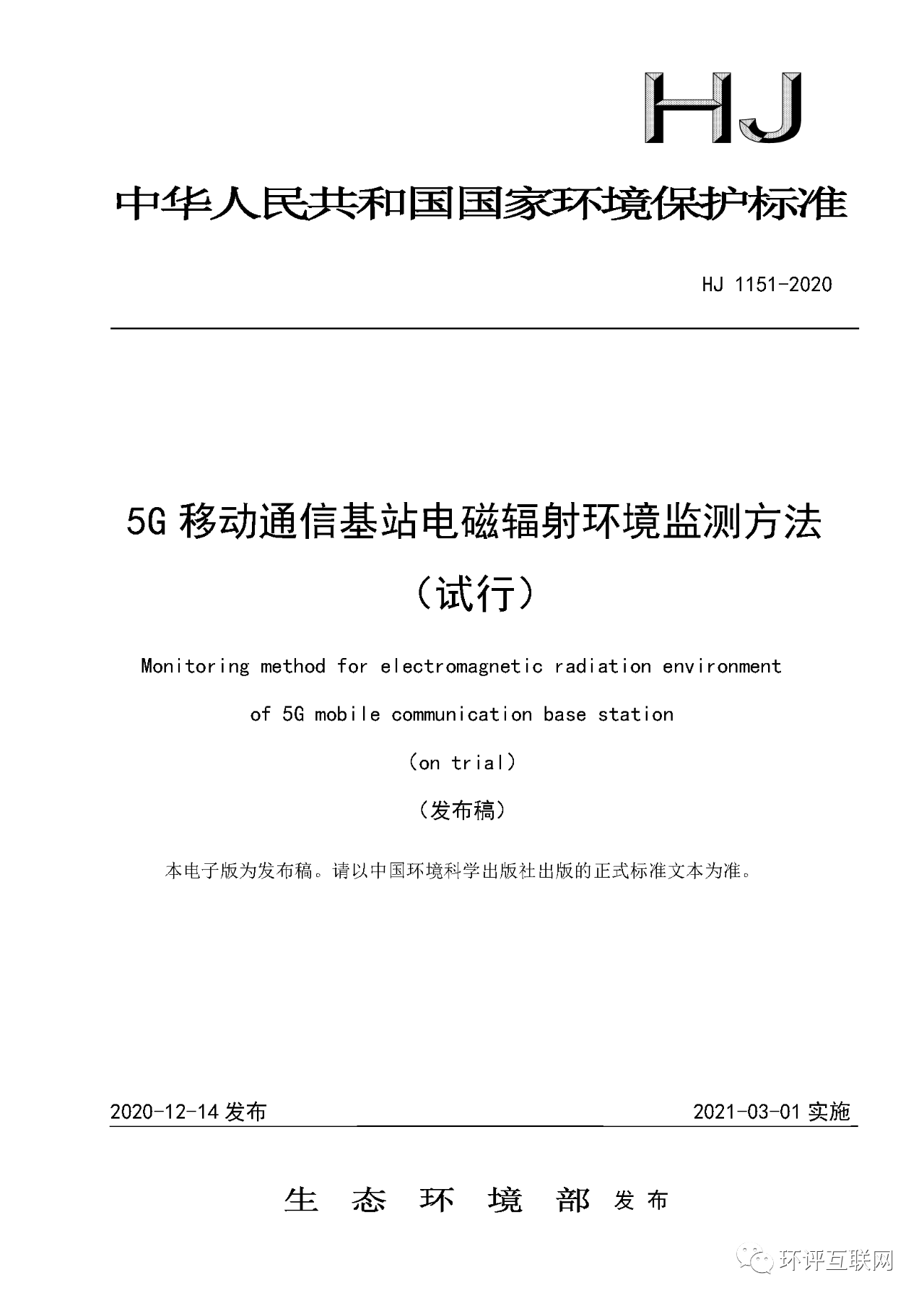 一、《5G移動(dòng)通信基站電磁輻射環(huán)境監(jiān)測(cè)方法(試行)》(HJ 1151-2020)