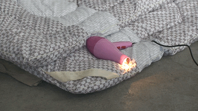 為了查證這個靠近起火點位置的斷頭線路究竟是哪種電器,火調(diào)員通過水洗篩選的辦法,在起火點附近的燃燒殘留物中發(fā)現(xiàn)了部分線路和一個金屬片,經(jīng)比對,該金屬片是電吹風上用于固定電阻絲的“云母片”。