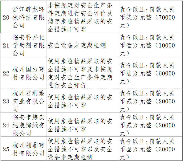 據(jù)了解,今年上半年,杭州市應急管理局一手抓駐企復工復產(chǎn)、一手抓安全生產(chǎn),已完成年度執(zhí)法計劃、專項檢查、聯(lián)合執(zhí)法、信訪舉報核查等,并對檢查中發(fā)現(xiàn)的安全生產(chǎn)違法違規(guī)企業(yè)(個人)進行了處罰。現(xiàn)對52家被行政處罰的企業(yè)(個人)進行曝光,希望各企業(yè)引以為戒!