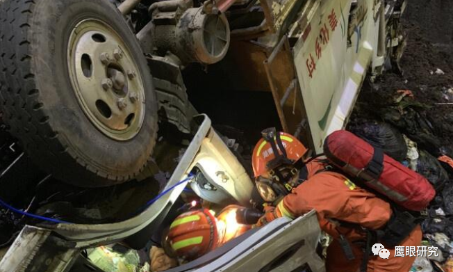 首批消防救援人員趕到現(xiàn)場了解得知,垃圾庫長 48 米、寬 20 米,總深度為 23 米,車輛從卸料平臺(tái)跌落至 12 米處的垃圾斜坡地段,呈車頂朝下、車底盤朝上倒翻狀態(tài),而且處于在垃圾坡度為 40 度左右的大斜坡上,隨時(shí)有更一步往下翻車至浸水區(qū)的危險(xiǎn)?,F(xiàn)場指揮員通過前期勘查,咨詢現(xiàn)場工作人員垃圾廢料區(qū)有無致命氣體危險(xiǎn)等相關(guān)情況后,迅速命令 4 名救援人員佩戴空氣呼吸器,攜帶破拆工具、有毒氣體探測儀、多功能救援擔(dān)架等救援設(shè)備利用軟梯、繩索下到事故救援點(diǎn)。由于車輛嚴(yán)重變形,導(dǎo)致救援操作困難被困者一時(shí)無法移出。
