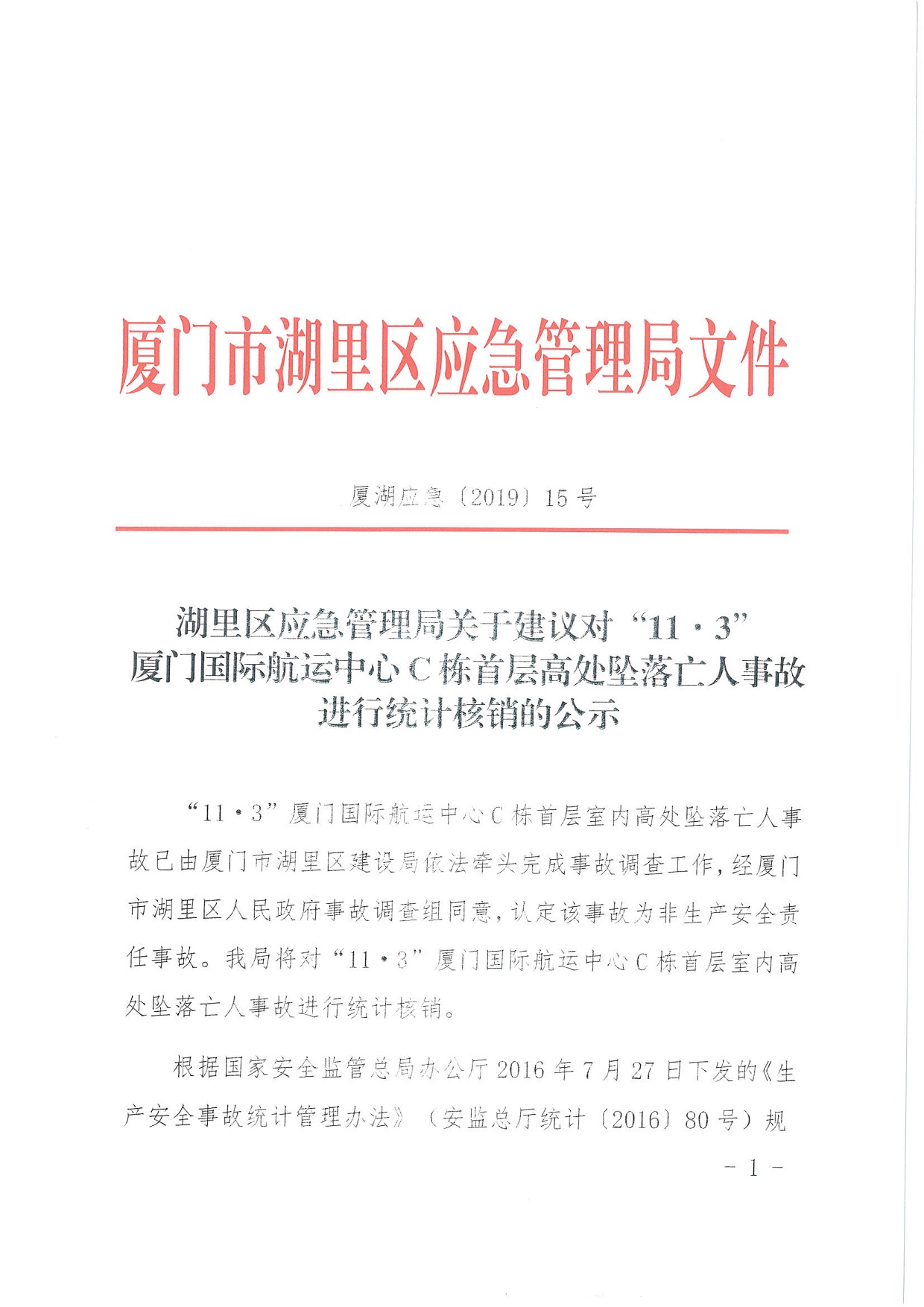 湖里區(qū)應急管理局關于建議對“11·3”廈門國際航運中心C棟首層高處墜落亡人事故進行統(tǒng)計核銷的公示