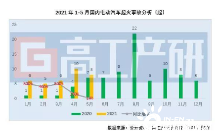 根據(jù)公告資料不完全統(tǒng)計(jì),2021年1-5月國(guó)內(nèi)共發(fā)生電動(dòng)汽車起火事故34起,較去年同期增加20起;涉及車輛數(shù)目38輛,較去年同期增長(zhǎng)73%,隨著國(guó)內(nèi)電動(dòng)汽車保有量的快速增長(zhǎng),起火事故備受業(yè)內(nèi)關(guān)注。
