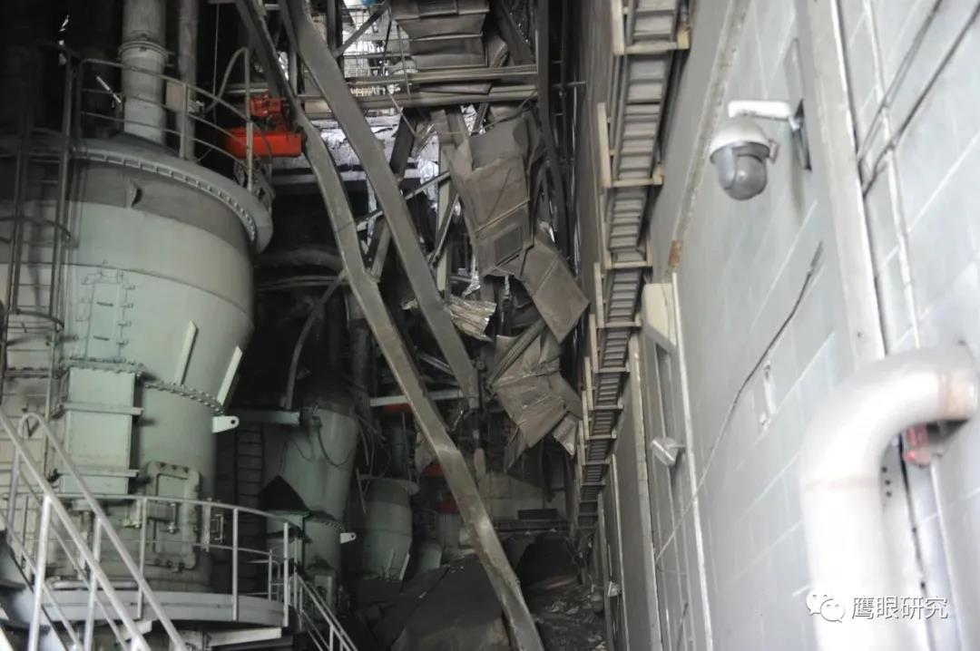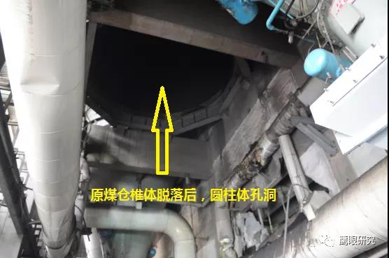 初步判斷#2爐2D原煤倉(cāng)錐形斗上方原始安裝焊口強(qiáng)度不夠,焊口斷開(kāi),造成原煤倉(cāng)下部錐體部脫落,將其下方的2D給煤機(jī)及平臺(tái)砸落,墜落至零米地面。