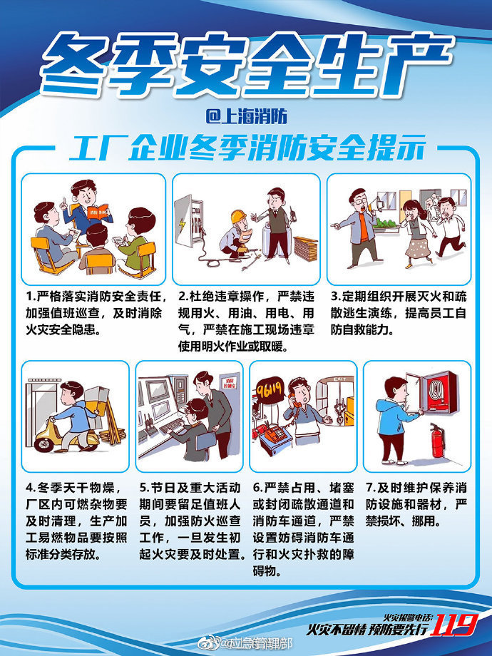 進(jìn)入冬季,工廠企業(yè)安全生產(chǎn)至關(guān)重要,各個(gè)生產(chǎn)單位切記做好檢查工作,防患于未然。加強(qiáng)值班巡查、嚴(yán)禁在施工現(xiàn)場(chǎng)違章使用明火作業(yè)或取暖、定期組織開(kāi)展滅火和疏散逃生演練……工廠企業(yè)冬季消防安全,這幾點(diǎn)要注意!